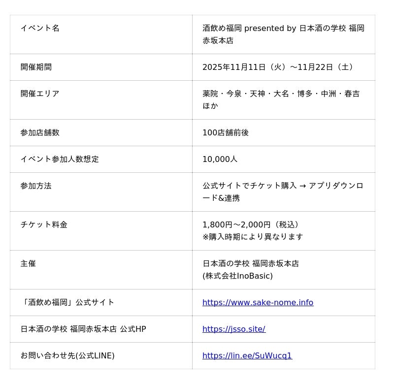 主催は、ITをバックグラウンドに持ち、その技術を駆使した専用アプリで"50種類以上の日本酒が1時間1,000円で飲み放題"を実現している日本酒バー「日本酒の学校 福岡赤坂本店(株式会社InoBasic)」です。