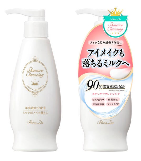 「パラドゥ スキンケアクレンジング」は、アイメイクまで落ちる高いクレンジング力と保湿力を兼ね備えた、美容液成分(※3) 90%配合のミルク状メイク落とし。