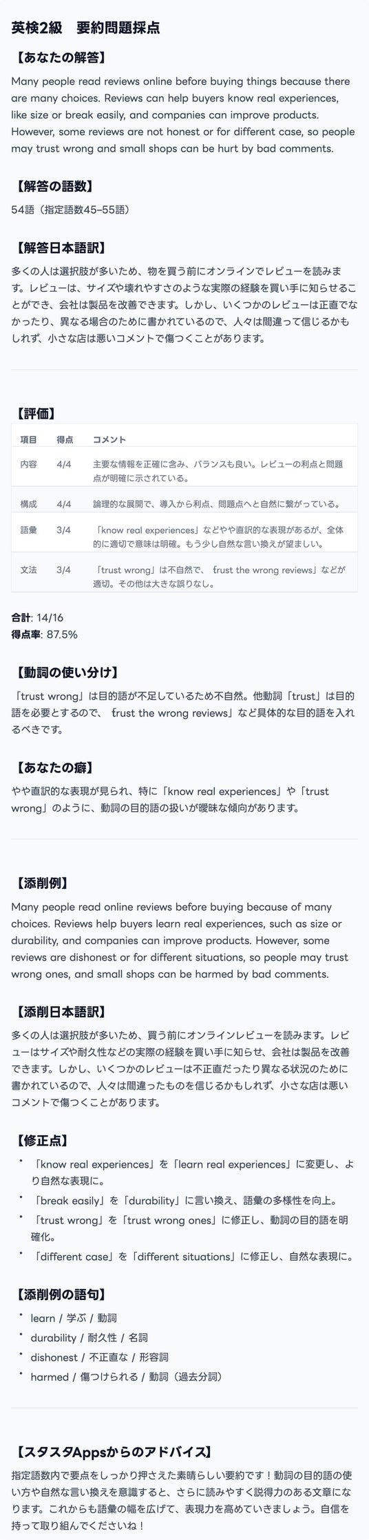 また、英検(R)の要約語数指定(例:2級 45~55語、準2級プラス 25~35語等)に合わせた練習ができるよう、級別の条件設計に反映しています。