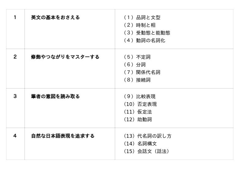 1.文法項目を再構成翻訳に必要な文法項目を再分類し、目的を意識しながら学べる構成になりました。