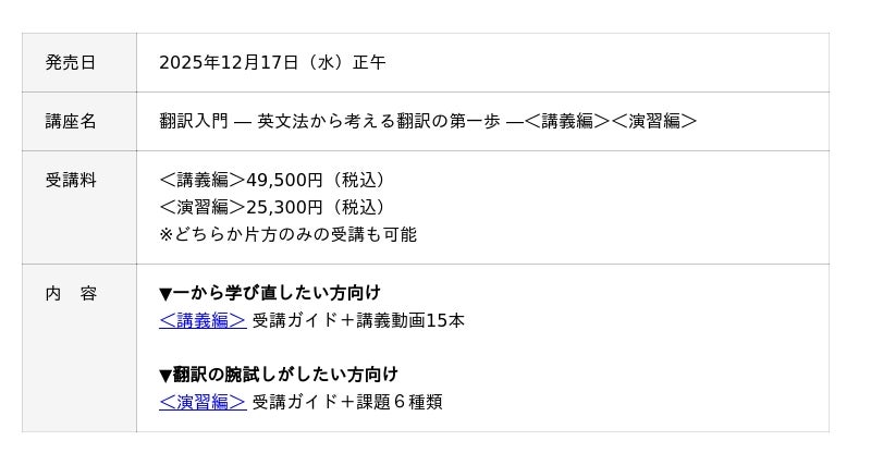 株式会社アメリア・ネットワーク(所在地:〒102-0076 東京都千代田区五番町2-13 林五ビル3階、代表:室田陽子)が運営する、翻訳学校フェロー・アカデミーは、翻訳を初めて学ぶ方に向けた基礎講座「翻訳入門<ステップ18>」を全面リニューアルし、2025年12月17日(水)正午より販売いたします。本講座は、学習者がこれまで培った英語力を翻訳スキルに結びつけられるよう設計されており、翻訳に関心を持ちながらも学習の入口や方法に迷う方に最適です!