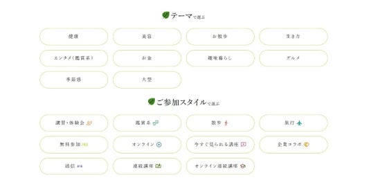 興味やライフスタイルに合わせて、テーマ(美容・健康・グルメ・散歩など)や参加スタイル(体験・鑑賞・オンラインなど)から簡単に検索できます。
