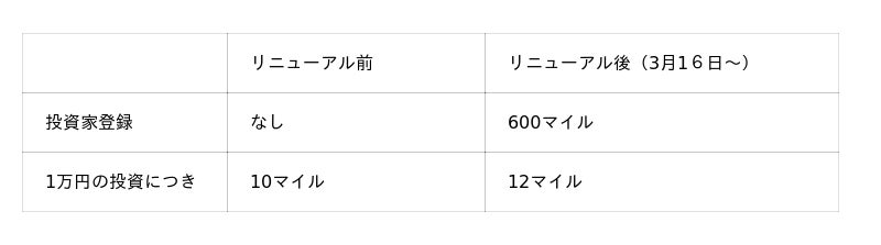 リニューアル後は、投資家登録で600マイル、1万円の投資につき12マイルが積算されます。