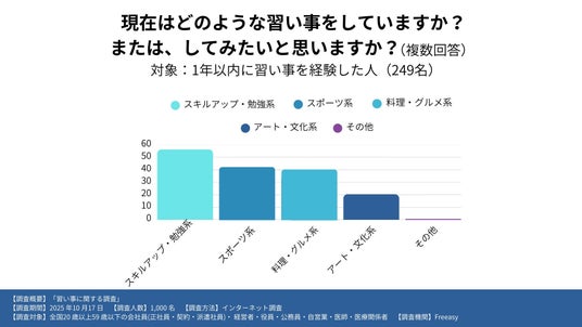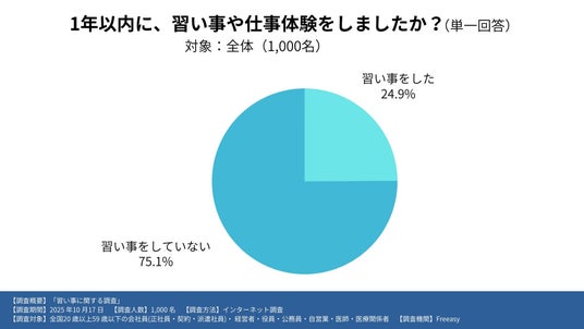 全国20歳以上59歳以下の男女に1年以内に習い事や仕事体験をしたか尋ねたところ、回答者の24.9%が「習い事をした」と回答。およそ4人に1人が、日常に“学ぶ時間”を取り入れていることが明らかになりました。