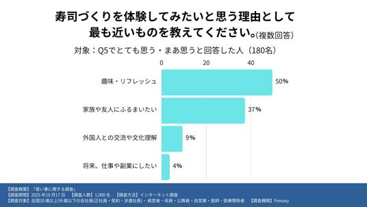 寿司づくりを習い事として体験してみたいと回答した人(180名)に理由を尋ねたところ、最も多かったのは「趣味・リフレッシュ(49.6%)」で、次いで「家族や友人にふるまいたい(37.3%)」となり、単なる技術習得ではなく、人とのつながりや自己表現の場として寿司を学びたいという声が多く寄せられました。