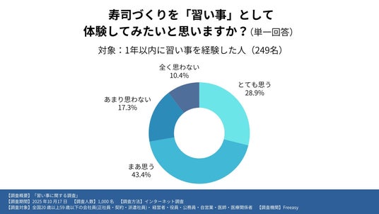 1年以内に習い事を経験した人の中で、寿司づくりを習い事として体験してみたいかと尋ねたところ、「とても思う」「まあ思う」と回答した人が72.3%にのぼり、多くの人が寿司づくりを学ぶことに関心を持っていることが分かりました。