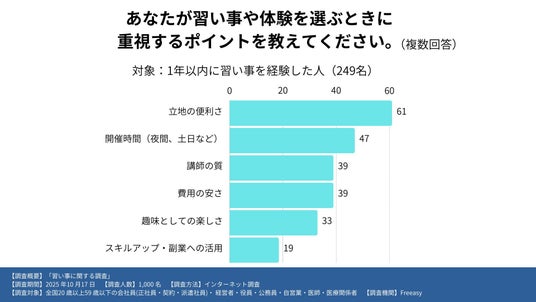 1年以内に習い事をしたことのある人249名を対象にアンケートを行ったところ、習い事や体験を選ぶ際に重視するポイントとして最も多かったのは「立地の便利さ(60.6%)」と「開催時間(47.4%)」であり、平日夜や週末など仕事と両立しやすい時間設定が重視されていることが明らかになりました。