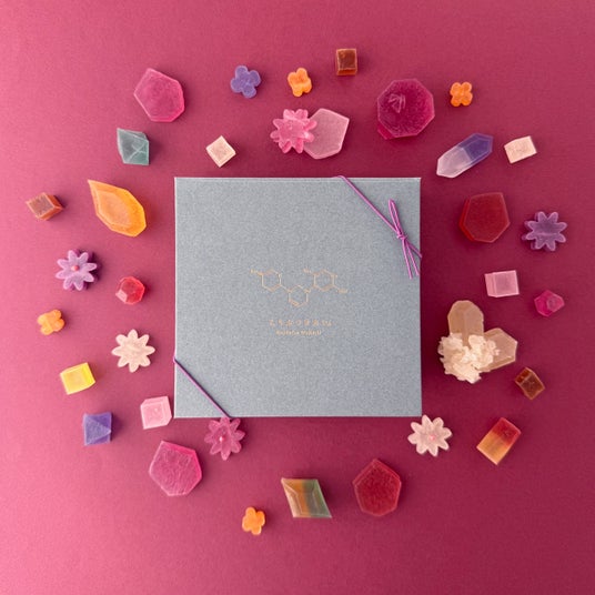 金木犀、コスモス、菊、ダリア、ケイトウ。秋を彩る花々と宝石をモチーフにした秋色の琥珀糖が登場。中央に入った日本式双晶はアップルシナモン味、赤い小さな宝石はカシス味、長崎の西海みかん味の金木犀のカケラ、こっくり美味しい黒糖味など、秋らしい味わいをまるで宝石箱のように詰め合わせました。季節を感じる贈り物や、読書のお供に。あっという間に過ぎていく秋を、アートなお菓子と共に味わってみてはいかがでしょうか。