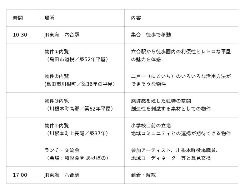 ツアー当日は、JR東海 六合駅(島田市)に集合し、島田市・川根本町の計4物件を内覧。その後、地域住民や先輩移住者、行政担当者らを交えた交流会を開催し、地域とのマッチングを深めます。