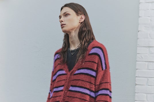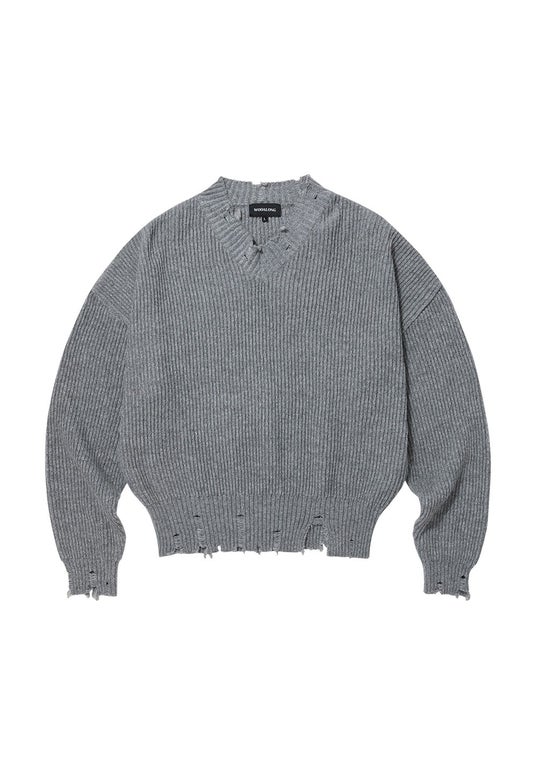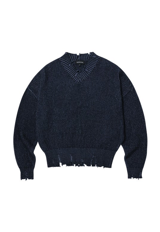 ゆったりとしたシルエット、Vネックですっきりとした首回りと、リブのダメージ加工のバランスを取ったアイテム