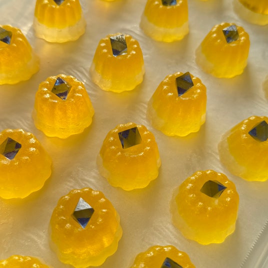 バナナ味とマスカット味の2層仕立てのゼリー型の琥珀糖に、小さな蛍石がキラリと光る