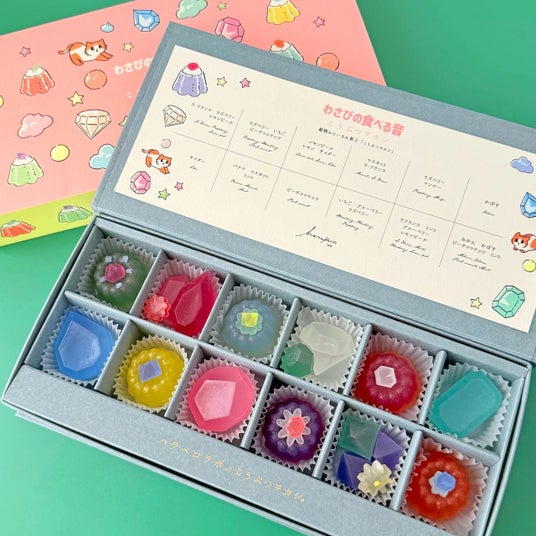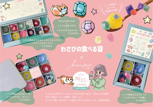 「ArtなFoodであそぶ」をテーマにプロダクトを展開するメルティングポットハラペコラボ株式会社(所在地:福岡県福岡市、以下 ハラペコラボ)は、大人気ASMR YouTubeチャンネル「わさびの食べる音」とのコラボスイーツが登場。レトロ喫茶のカラフルゼリーと宝石をモチーフに、職人が手作業で仕上げる琥珀糖で表現した『レトロ喫茶な宝石ゼリーのこうぶつヲカシ』全3種と『宝石アイシングクッキー』を、期間限定で公式オンラインストア、福岡本店にて受注販売いたします。予約受付期間は、2025年10月17日~10月30日、11月5日より順次発送。琥珀糖の特徴である”食べる音”を、実際に味わうスイーツ体験をお楽しみいただけます。