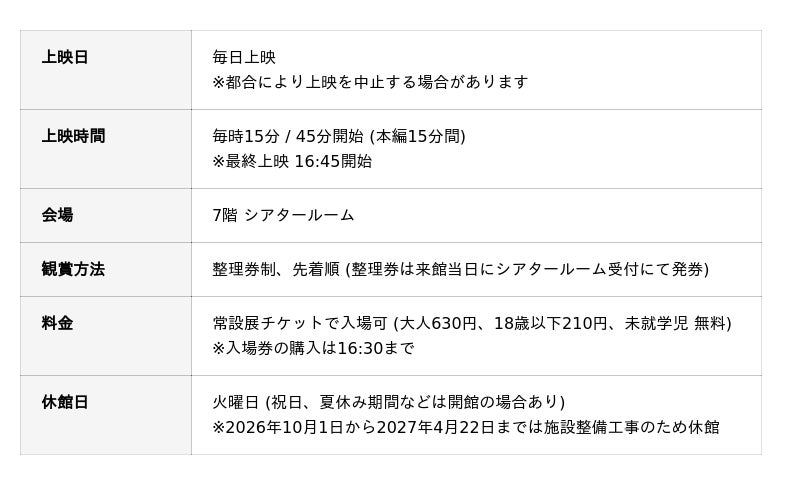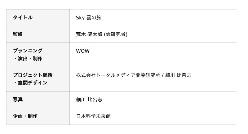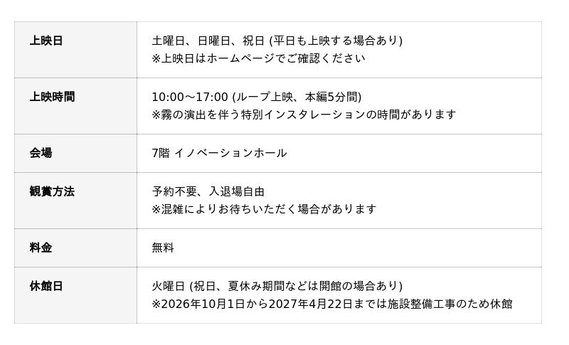 日本科学未来館 (略称:未来館 館長:浅川智恵子)は、惑星探査と気象観測をテーマにした2つの没入型インスタレーション作品を、7階に新たに誕生するイマーシブ型体験空間「シアタールーム」とリニューアルした「イノベーションホール」で2026年4月25日(土)から公開します。人類未踏の星々を巡る非日常と、刻々と姿を変える雲の世界を、科学データにもとづく映像・音響、そして霧や風などの演出で立体的に再現。その世界に入り込んだかのような没入体験を通して宇宙や地球の壮大さに出会います。