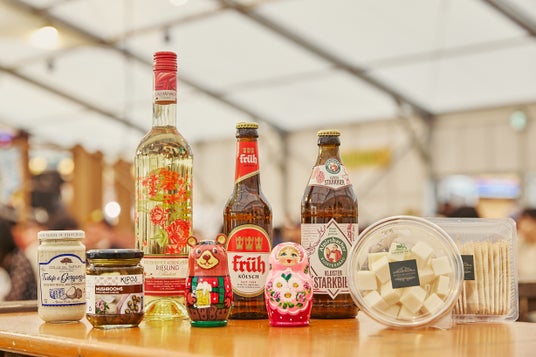 画像左から)ドイツ産の美味しい飲み物と食べ物(ドイチェスハウス)、マトリョシカ(マトリョシカ)、グラスフェッドチーズ(ANGEL’S DELICA TESSEN)