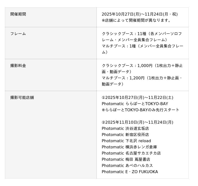 三度目のコラボレーションとなる今回は、LaLa arena TOKYO-BAYでも実施される=LOVE 8周年ツアー「=LOVE 8th ANNIVERSARY PREMIUM TOUR」の開催に合わせ、ライブ会場近隣のPhotomatic ららぽーとTOKYO-BAYで2025年10月27日(月)から先行スタート。2025年11月10日(月)からは、渋谷・大阪・名古屋など9カ所のPhotomaticで全国に展開いたします。