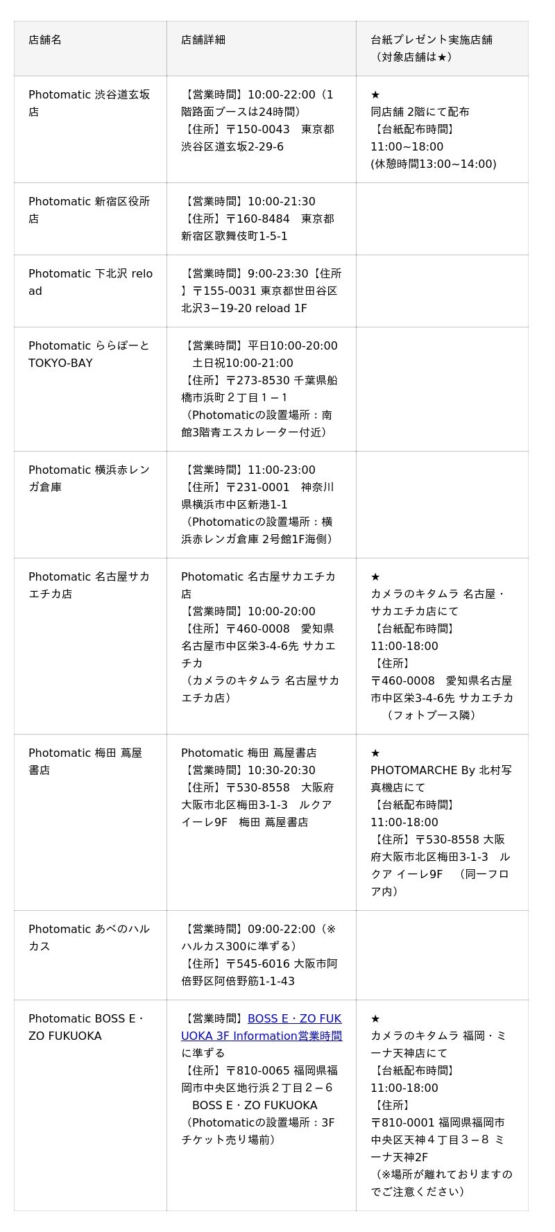 ※フォトブースの所在地と台紙引き換え店舗が異なる場合がございますので、ご確認の上ご来店ください。