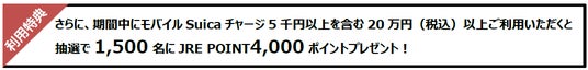 ※利用特典は、モバイルSuicaチャージ5,000円以上*を含む200,000円(税込)以上利用された方の中から、抽選で1,500名さまへJRE POINT(期間限定ポイント)4,000ポイントをプレゼントします。*定期券購入時のSuicaチャージを除く