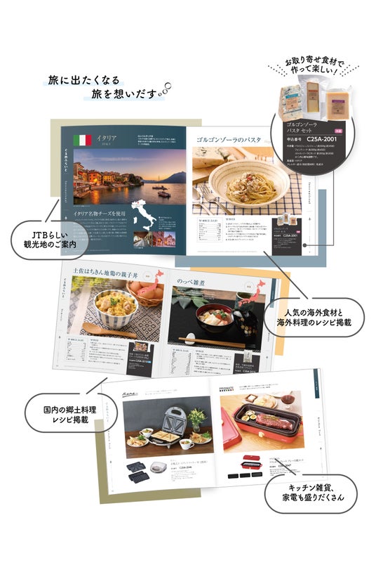 観光情報や食文化の紹介とあわせて、世界各地で親しまれている料理レシピを掲載し、お取り寄せ食材を用いて、ご自宅で学んで作って楽しめる新しいカタログギフトです。