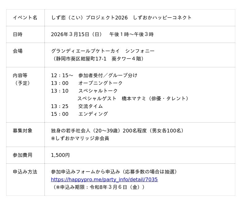 このたび、非会員の若手社会人(男女)を対象とした大型交流イベント「しずおかハッピーコネクト」を初開催します。