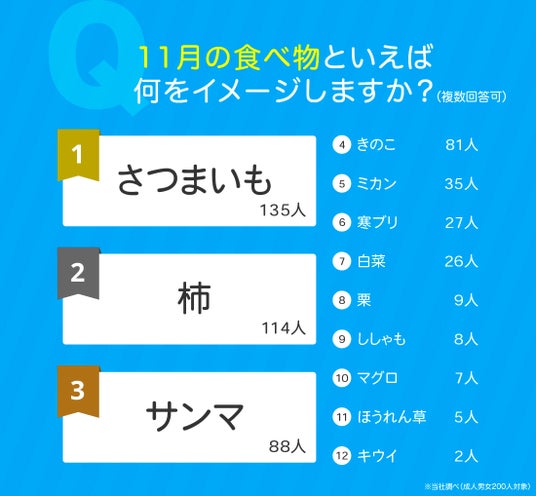 成人男女200人に、11月の食べ物といえば何をイメージするか尋ねたところ、1位は「さつまいも」でした。