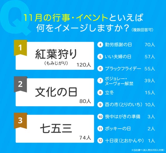また、「文化の日」「七五三」「勤労感謝の日」が上位にランクインしたことから、11月は祝日や伝統的な行事を連想する人が多いことがわかりました。