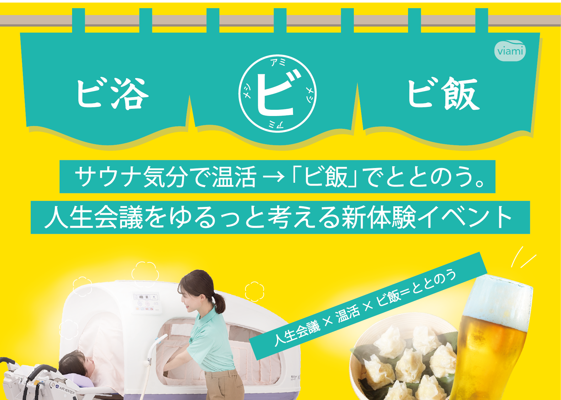 ※「ビ飯(びめし)」とは、シャワー入浴装置「美浴(びあみ)」で心地よく汗をかき、 心身が「ととのった」状態で味わう食の時間のことです。美浴でシャワーを浴びて全身が温まった後に味わうご飯が格別であることから、その体験を略して「ビ飯(びめし)」と呼んでいます。