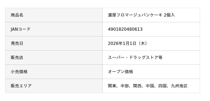敷島製パン株式会社(Pasco)は「濃厚フロマージュパンケーキ 2個入」を、2026年1月1日(木)より関東、中部、関西、中国、四国、九州地区にて発売します。