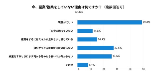 非副業/複業者に対し、実施していない理由を聞いたところ「現職が忙しい」が49%、「自分ができる複業が何か分からない」が27.5%、「まず何から始めたら良いのか分からない」が26%という結果になりました。