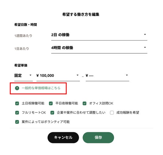 当社のサービス「複業クラウド」では、ご自身の適正な報酬が分からない方のために、プロフィール入力時に単価相場表をご参照いただけます。今後も、誰もが複業を始めやすい環境づくりを推進し、「複業」が当たり前の社会の実現を目指してまいります。