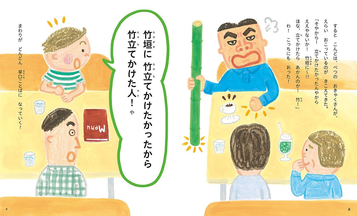 つっかえずに読めたらあなたは早口言葉名人!大人から子供まで、一緒によんで楽しい早口絵本です。