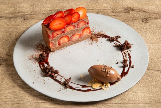 チョコレートガナッシュを何層にも重ね、仕上げに苺を飾りミルクレープ仕立てに。濃厚なチョコレートアイスを添えて。数量限定のクレープです。