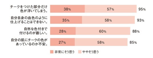 さらに、40代以上の方にチーク使用時の悩みを調査したところ、9割以上※2が「色」と「塗布時の不自然さ」に対して不満を感じていることがわかっています。