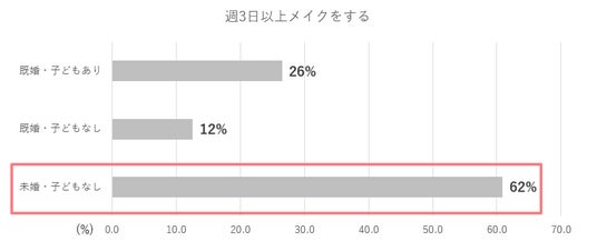 前問での回答結果を婚姻状況別に振り分けた結果、週3日以上メイクをする回答者の内、約6割が「未婚」。約4割が「既婚」の方となりました。メイクをしている・していないの判断には個人差があるものの、生活環境の変化によりメイクを行う機会や頻度が少なくなる傾向があることが推察される結果となりました。