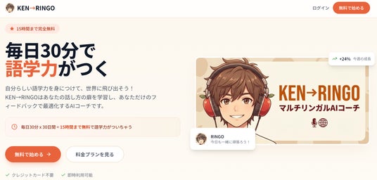 KEN→RINGOは、AIがユーザーの会話パターン・癖・ミスを自動学習し、一人ひとりに最適化されたフィードバックを提供するマルチリンガルAI英会話コーチです。英語・スペイン語・中国語・韓国語・フランス語・ドイツ語・日本語の7か国語に対応し、月額0円(毎日30分無料)から利用できます。従来のAI英会話にない「癖学習」技術により、使えば使うほど自分だけのパーソナルコーチに進化します。