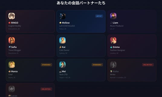 RINGO、Mellow、Liam、Sofia、Kai、Emma、Marco、Mei、Aisha、Lucasの10体のAIキャラクターから、好きな相手を選んで英会話ができます。LA出身の音楽プロデューサー、バルセロナの旅ブロガー、東京のLoFiボーカリストなど、それぞれ異なる個性・話題・語彙を持つキャラクターとの会話で、飽きずに多角的な英語力を磨けます。