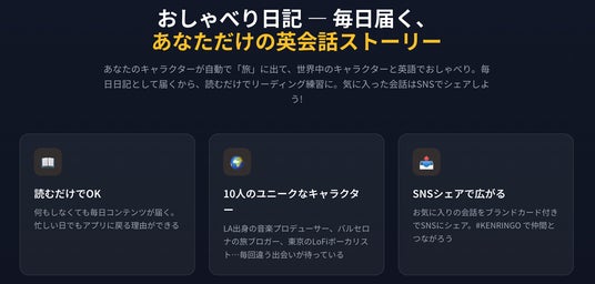 あなたのキャラクターが自動で「旅」に出て、世界中のキャラクターと英語でおしゃべり。その内容が毎日日記として届きます。読むだけでリーディング練習になり、忙しい日でもアプリに戻る理由ができます。お気に入りの会話はブランドカード付きでSNSにシェアでき、#KENRINGOで仲間とつながれます。