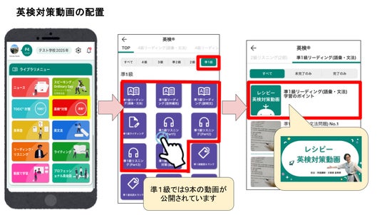『レシピー』アプリ内のライブラリメニュー「英検対策」から、準1級の学習したいコンテンツ(以下参照)を選択し、動画を視聴してください。