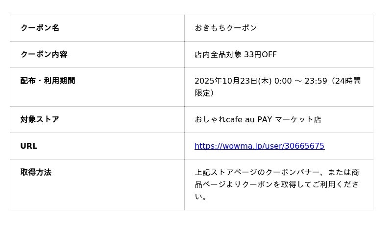 コスメから医薬品、調理器具まで、暮らしを豊かにするアイテムを取り扱う「おしゃれcafe」を運営するピュアクリエイト株式会社(本社:埼玉県熊谷市)は、日頃のご愛顧への感謝を込めて、au PAY マーケットの「三太郎の日」に合わせ、ささやかな「おきもちクーポン」(33円OFF)を発行することをお知らせいたします。2025年10月23日(木)の24時間限定で、店内の全品にご利用いただけます。
