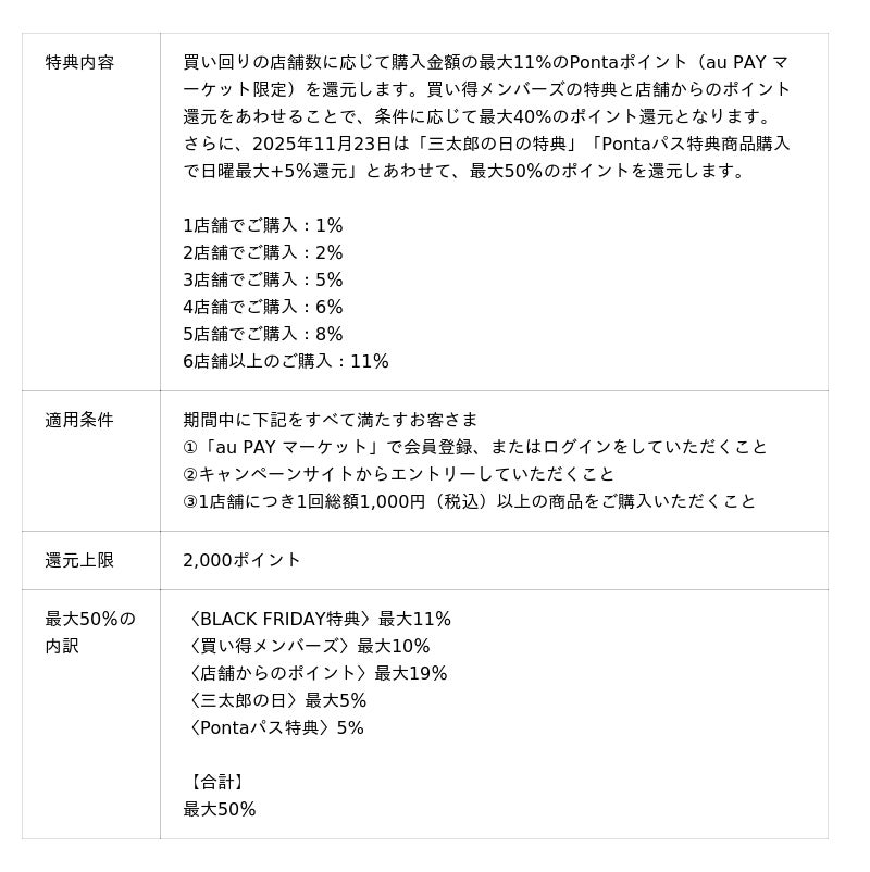 今年のBLACK FRIDAYは、物価上昇が続く中でお客さまの毎日のお買い物を応援するため、昨年を上回る顧客体験の提供を目指し、最大40%のポイントを還元します。さらに、2025年11月23日は「三太郎の日特典(+5%)」と「Pontaパス特典(日曜日のお買い物で+5%)」が重なり、合計で最大50%のポイント還元となる年間で最もおトクな1日です 。