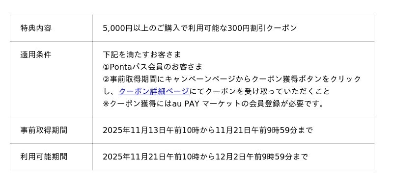 そのほか、ハズレなしで最大1万円クーポンがあたるPontaパス会員限定特典ガチャや、初日(11月21日)・最終日(12月2日)限定で対象商品が50%以上になる割引クーポンの配布、人気店舗とコラボレーションしたおトクなセールなどのBLACK FRIDAY 2025特典を多数ご用意しています。