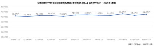 転職後に「年収増加」した個人の年収は、平均で72.7万円(前月差:+1.1万円)増加しました。