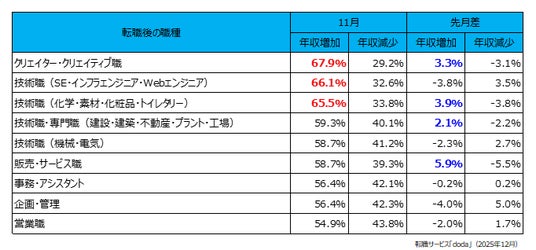 転職後に年収増加した個人が多かった職種は、「クリエイター・クリエイティブ職」(67.9%)、次いで「技術職(SE・インフラエンジニア・Webエンジニア)」(66.1%)、そして「技術職(化学・素材・化粧品・トイレタリー)」(65.5%)が続きました。