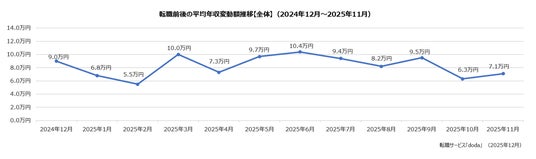 パーソルキャリア株式会社が運営する転職サービス「doda(デューダ)」(編集長:桜井 貴史)は、dodaエージェントサービスを利用して2025年11月に転職決定した個人の、転職前後の平均年収変動額と年収変動割合を発表いたします。