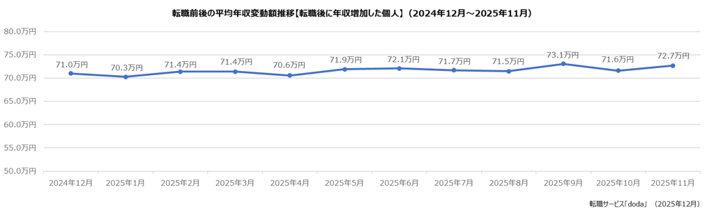 転職後に「年収増加」した個人の年収は、平均で72.7万円(前月差:+1.1万円)増加しました。