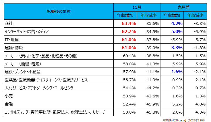 転職後に年収増加した個人が多かった業種は、「商社」(63.4%)、次いで「インターネット・広告・メディア」(62.7%)、そして「IT・通信」と「運輸・物流」(61.0%)が続きました。