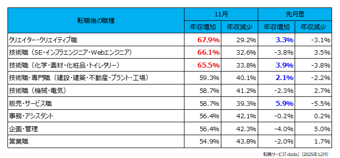 転職後に年収増加した個人が多かった職種は、「クリエイター・クリエイティブ職」(67.9%)、次いで「技術職(SE・インフラエンジニア・Webエンジニア)」(66.1%)、そして「技術職(化学・素材・化粧品・トイレタリー)」(65.5%)が続きました。