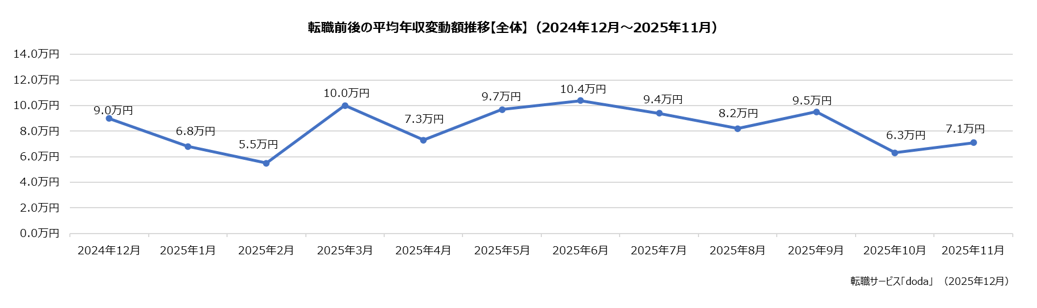 1.全体転職前後の年収は、平均で7.1万円(前月差:+0.8万円)増加しました。