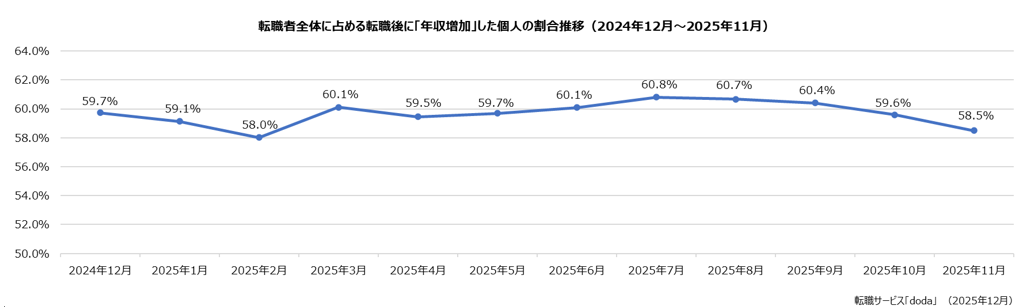 転職後に「年収増加」した個人の割合は、58.5%(前月差:-1.1ポイント)でした。