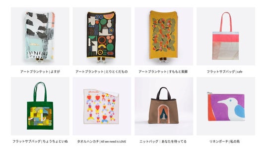 アートブランケット(大判サイズ)をはじめ、フラットサブバッグ、リネンポーチ、ニットバッグ、タオルハンカチなど、アートを日常に取り入れられるアイテムをラインナップ。下記は取り扱い商品の一例です。会場ではこのほかにも多数のアートアイテムをご覧いただけます。