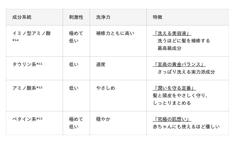 洗浄成分はタウリン系*¹¹・アミノ酸系*¹²・ベタイン系*¹³・補修のイミノ型アミノ酸系*¹⁴等のミックス。毛髪補修の土台として理想的な洗浄力と低い刺激性を実現しています。